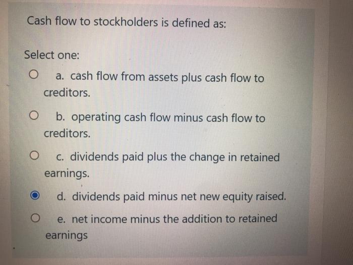Cash Flow To Stockholders Is The Amount Of That A Company Pays Out To Its.