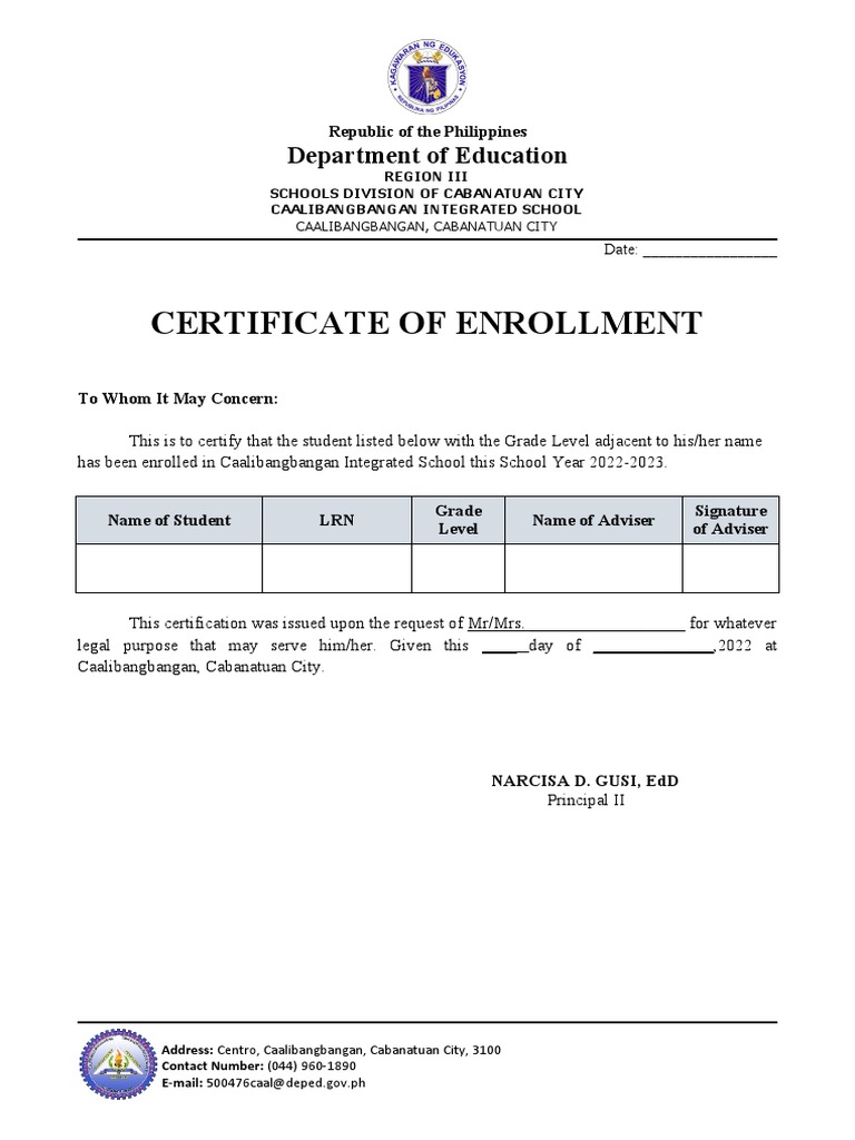 CERT sample certificate for enrolment Department of Education
