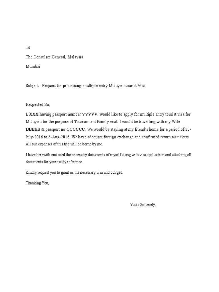 Dear sir / madam, i, _________________ (name as on passport) holding indian passport number __________ ____. Just like with most countries, malaysia requires individuals applying for a visa to submit a cover letter. What is a visa cover letter? A visa cover letter is a personal statement addressed to the consulate or embassy, submitted alongside. It can be quite difficult.