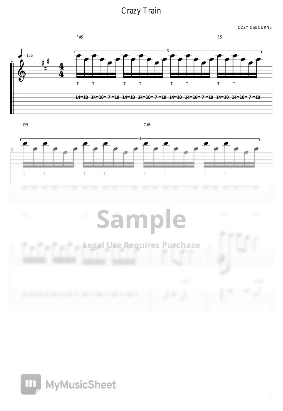 OZZY OSBOURNE Crazy Train (guitar solo) Tab + 1staff by guitar cover