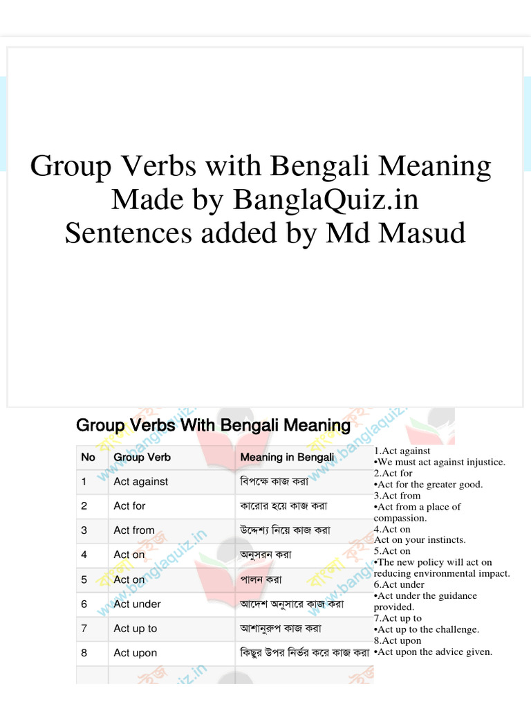 A “phrasal verb” is a combination of a verb and a preposition or an adverb (or both) that creates a meaning different from the original verb. Act as ( নহখসখে কাজ করা ) he acted. 1000 common phrasal verbs act against ( নেরুখে কাজ করা ): A phrasal verb is a combination of a normal verb and an adverb or.